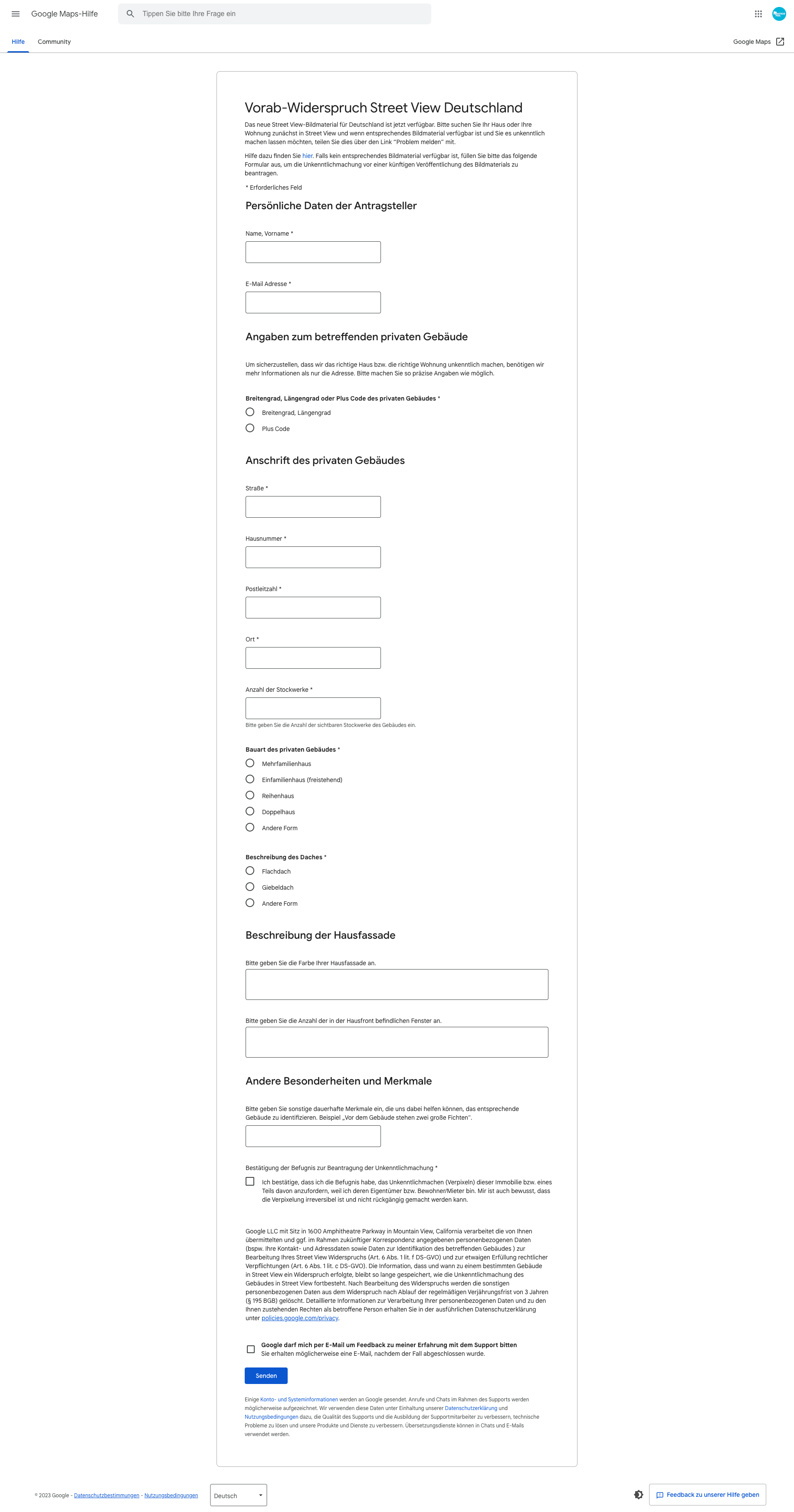 Schicke den (angepassten) Widerspruch an die Mail-Adresse: streetview_deutschland@google.com oder per Post an: Google LLC, Street View, PO Box 111607, 20416 Hamburg. Bitte beachte, dass ein früherer Widerspruch nicht für die neuen Aufnahmen gilt. Du musst erneut widersprechen.